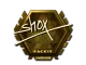 Sticker | shox (Gold) | London 2018$397.78This sticker can be applied to any weapon you own and can be scraped to look more worn. You can scrape the same sticker multiple times, making it a bit more worn each time, until it is removed from the weapon.<br><br>This gold sticker was autographed by professional player Richard Papillon playing for G2 Esports at London 2018.\n\n50% of the proceeds from the sale of this sticker support the included players and organizations. The Sticker | shox (Gold) | London 2018 is an Extraordinary-grade skin in Counter-Strike 2. With a Extraordinary rarity classification, it has approximately a ~0.26% chance of dropping from case openings.